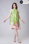 This sleeveless pleated dress features a refined floral print on smooth Japan satin fabric, offering a lightweight yet structured silhouette. The one-shoulder tie-up design adds a sophisticated touch, enhancing its elegant appeal for special occasions or stylish daywear. Crafted for women seeking a blend of contemporary design and comfort, this dress combines delicate pleats with breathable material for all-day confidence and grace.