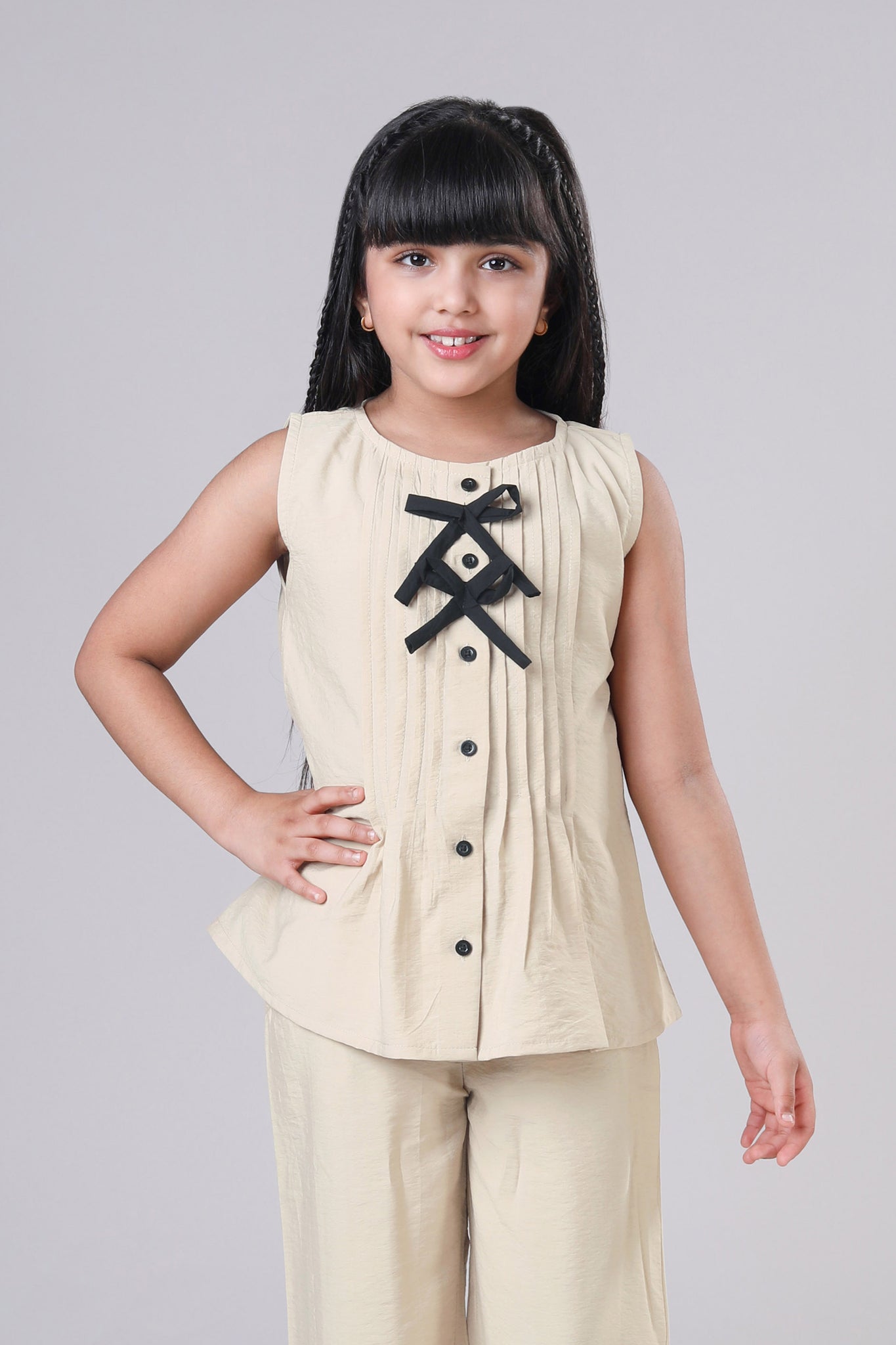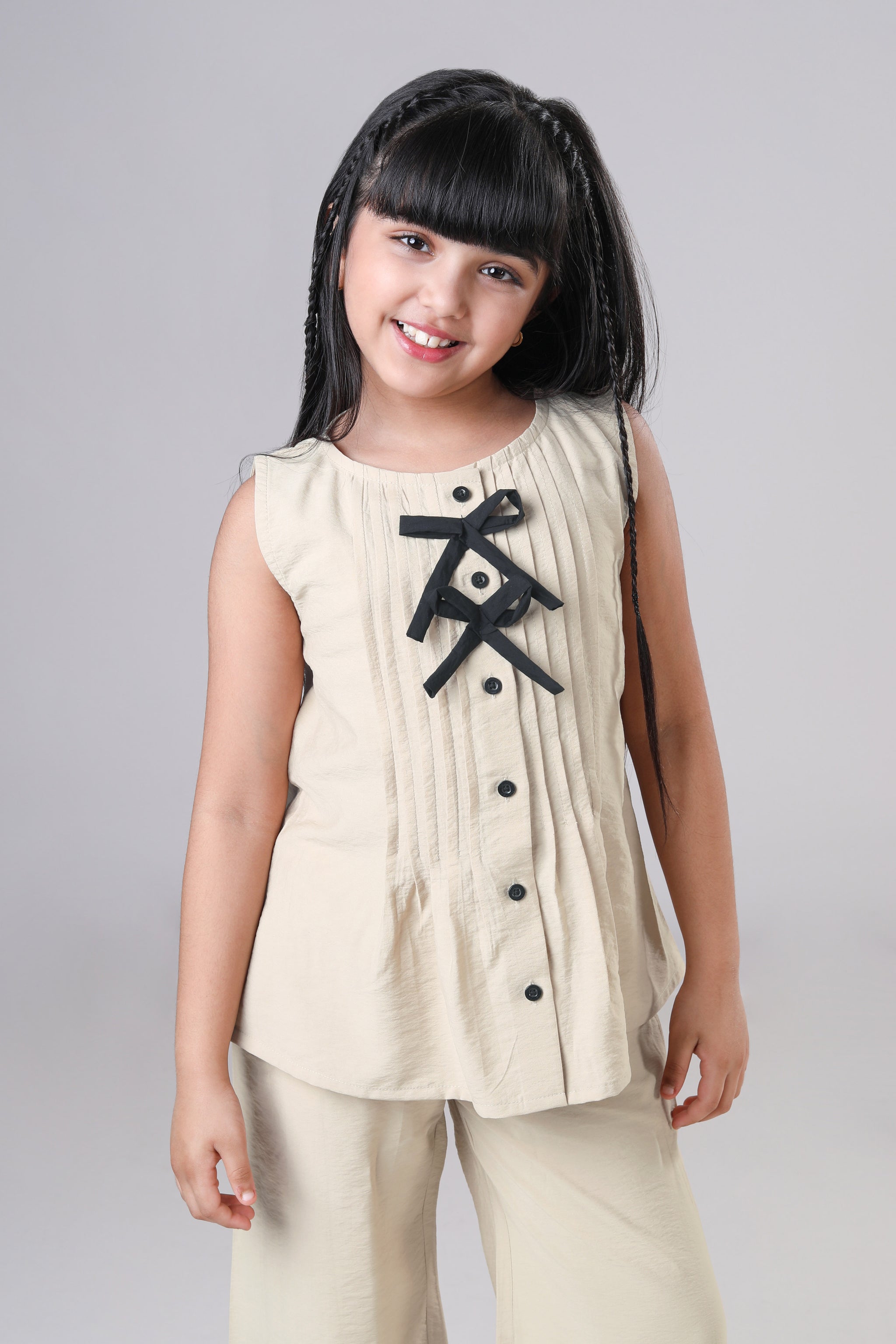 Introducing the perfect canvas for your girl's style adventures! This cream-colored sleeveless top features a classic round neckline and is made from pure cotton that feels as good as it looks. Light, breathable, and oh-so-comfortable, it's ready for playground fun, family gatherings, or lazy weekend days. Mix and match with her favorite skirts, pants, or leggings for endless outfit possibilities. Simple, sweet, and wonderfully wearable—this top is a wardrobe staple she'll reach for again and again.