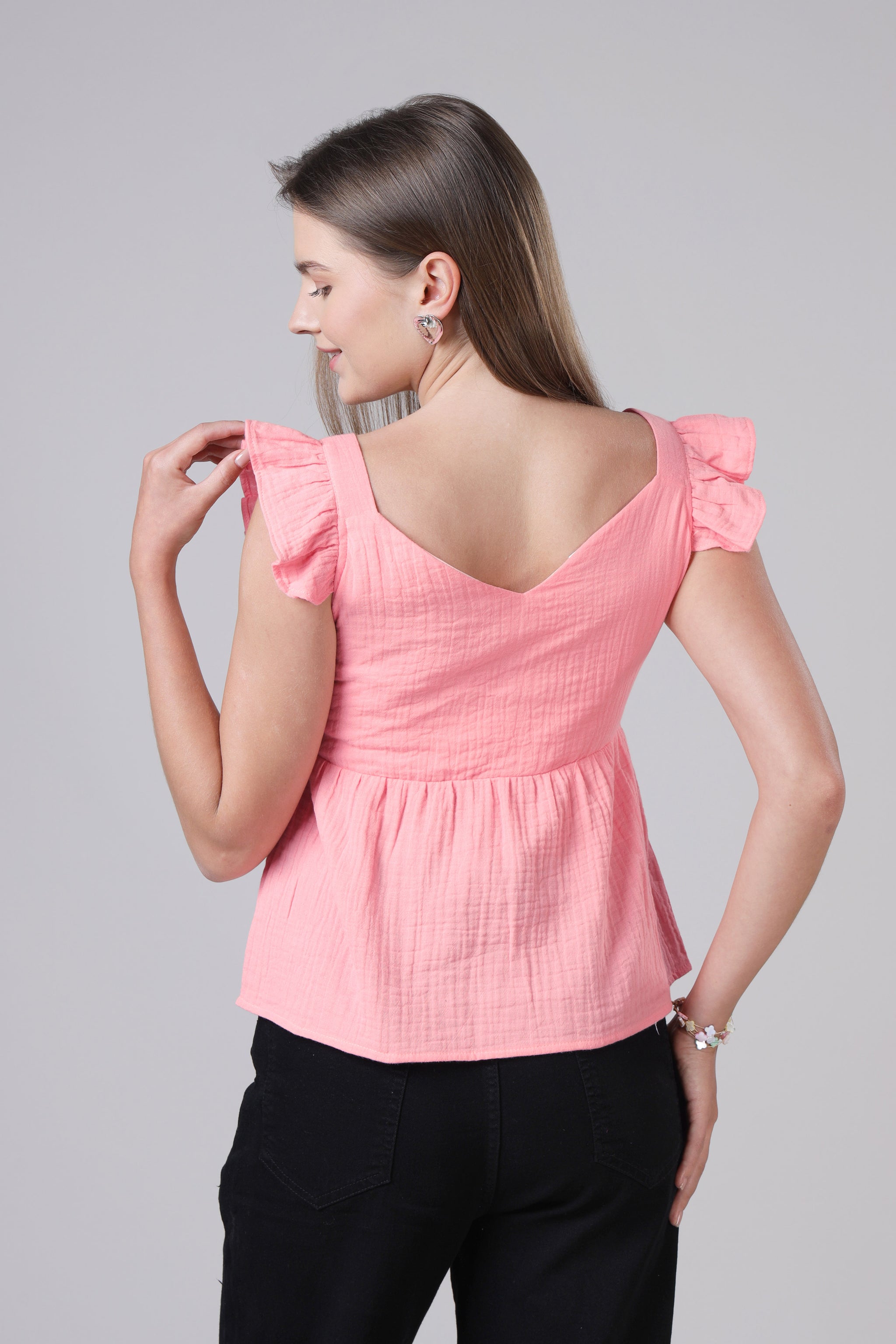 Rose Pink Soft Luxe Pure Cotton Flutter Sleeve Double Cloth Womens Top