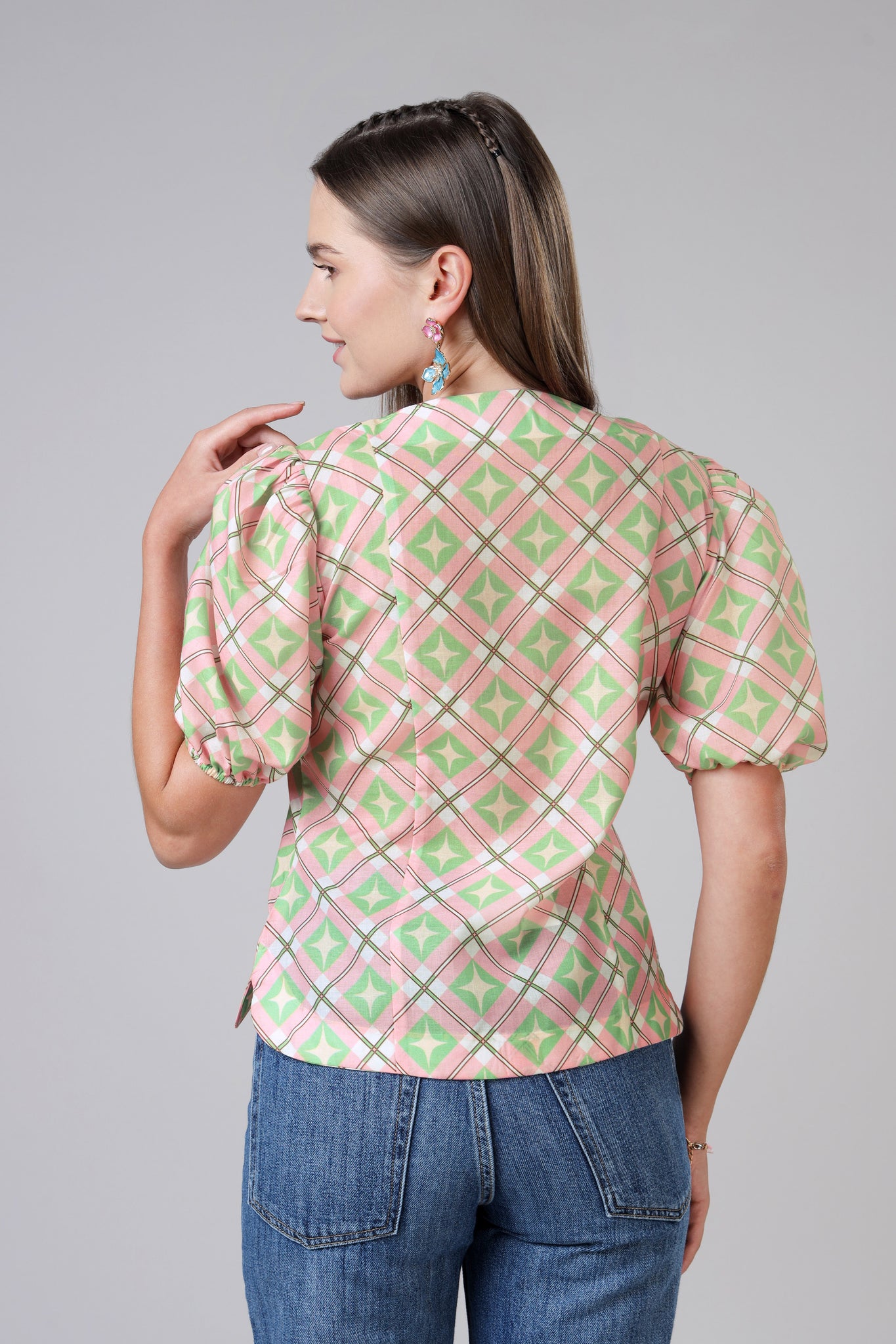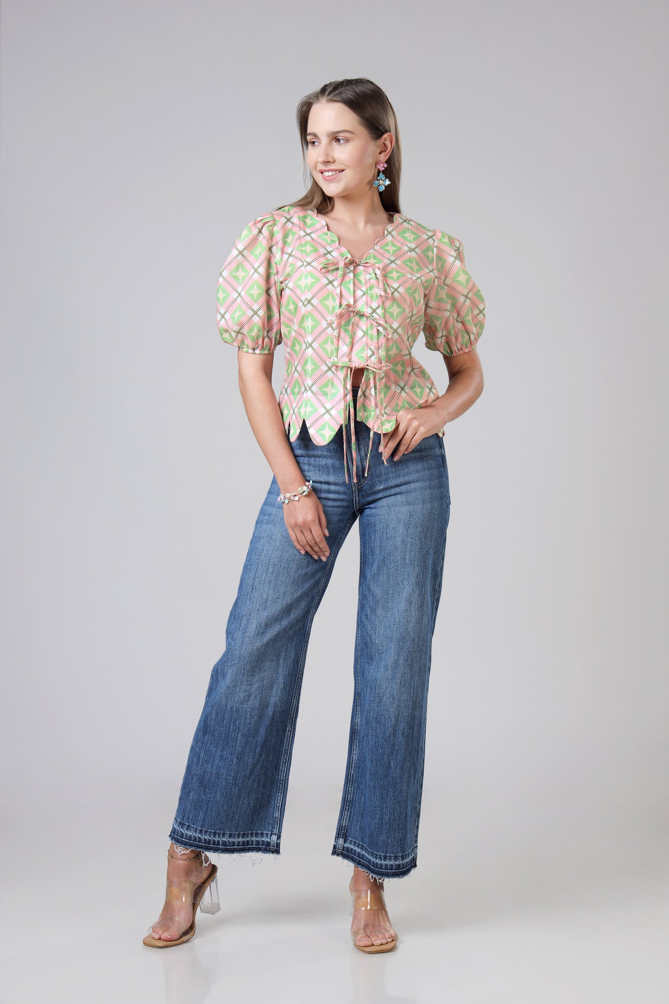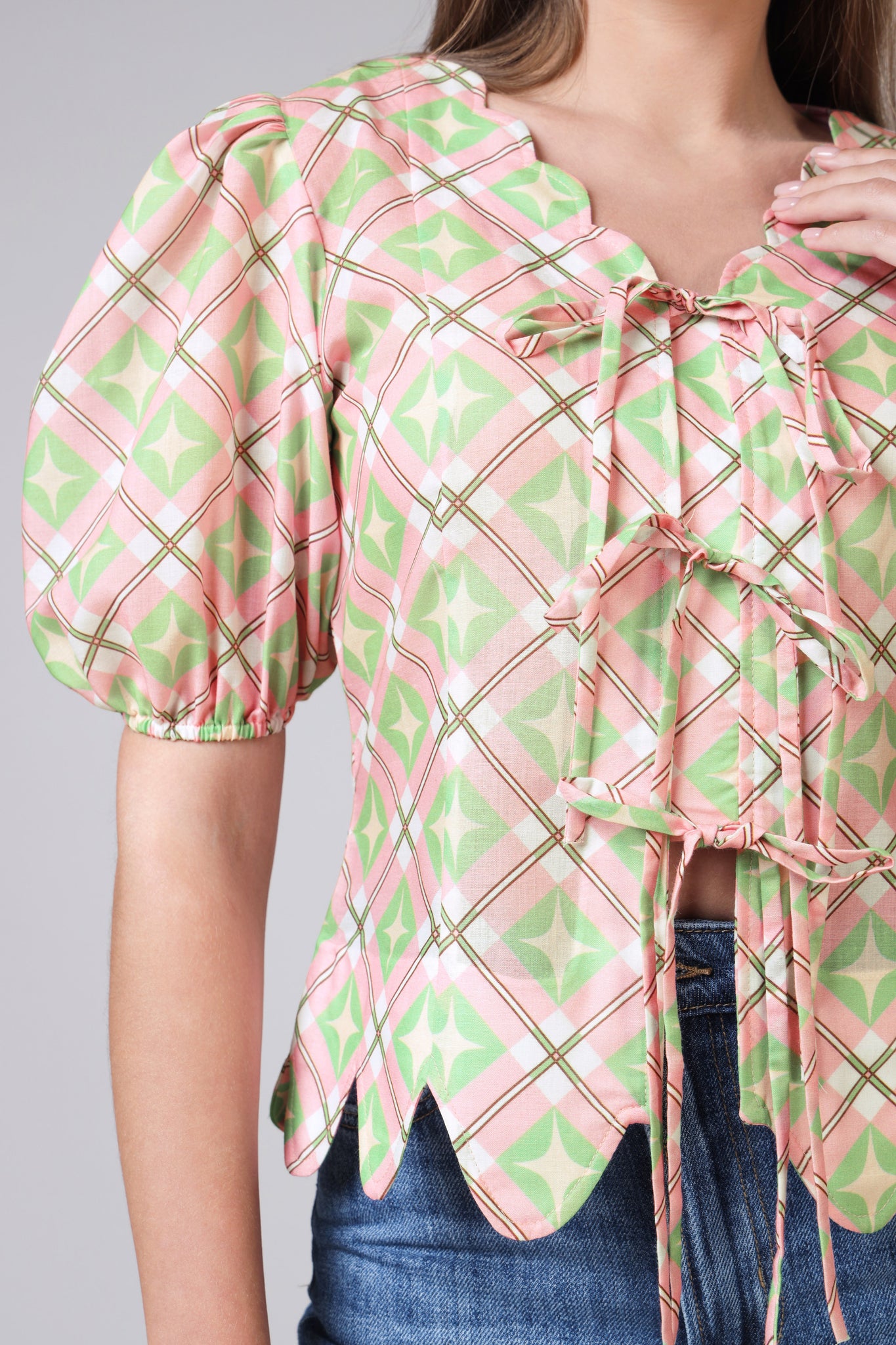 Womens Geometric Tie-Up Top With Puff Sleeves And Scallop Hem